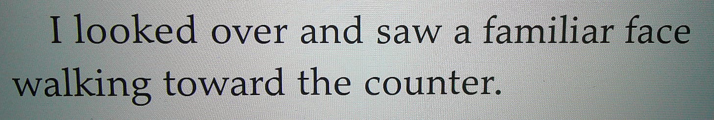 The Snarky Editor respectfully points out that faces can’t walk, because they don’t have legs. This author would have been better off to stop with I looked over and saw a familiar face.