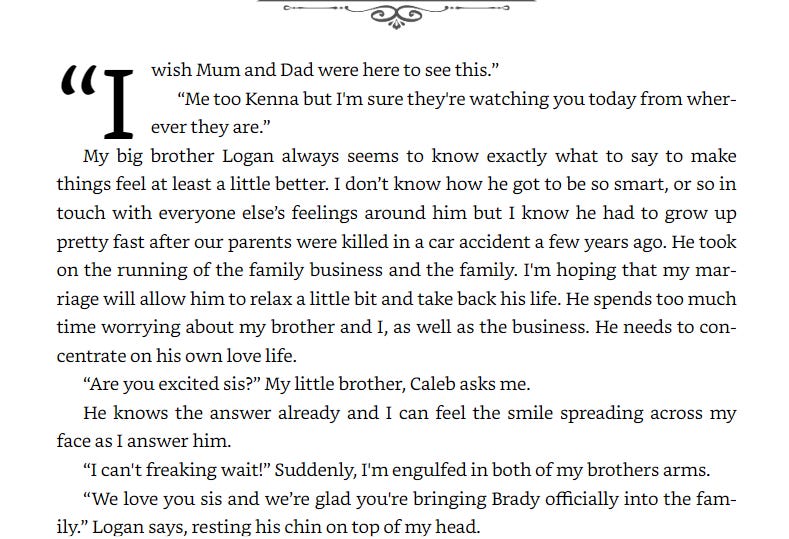 “My little brother Caleb asks me.” There are two ways to handle this construction, and either one is acceptable. Either the name is separated from the rest of the surrounding sentence by two commas, or — because the name is so brief and so closely related to the noun it’s associated with — no commas. But it shouldn’t be set off with just one comma. Compare this with the earlier sentence starting “My big brother Logan always seems…” which is correct, though “My big brother, Logan, always seems…” would also be just fine. In this case, the Snarky Editor opted for consistency by treating both brothers in the same way.